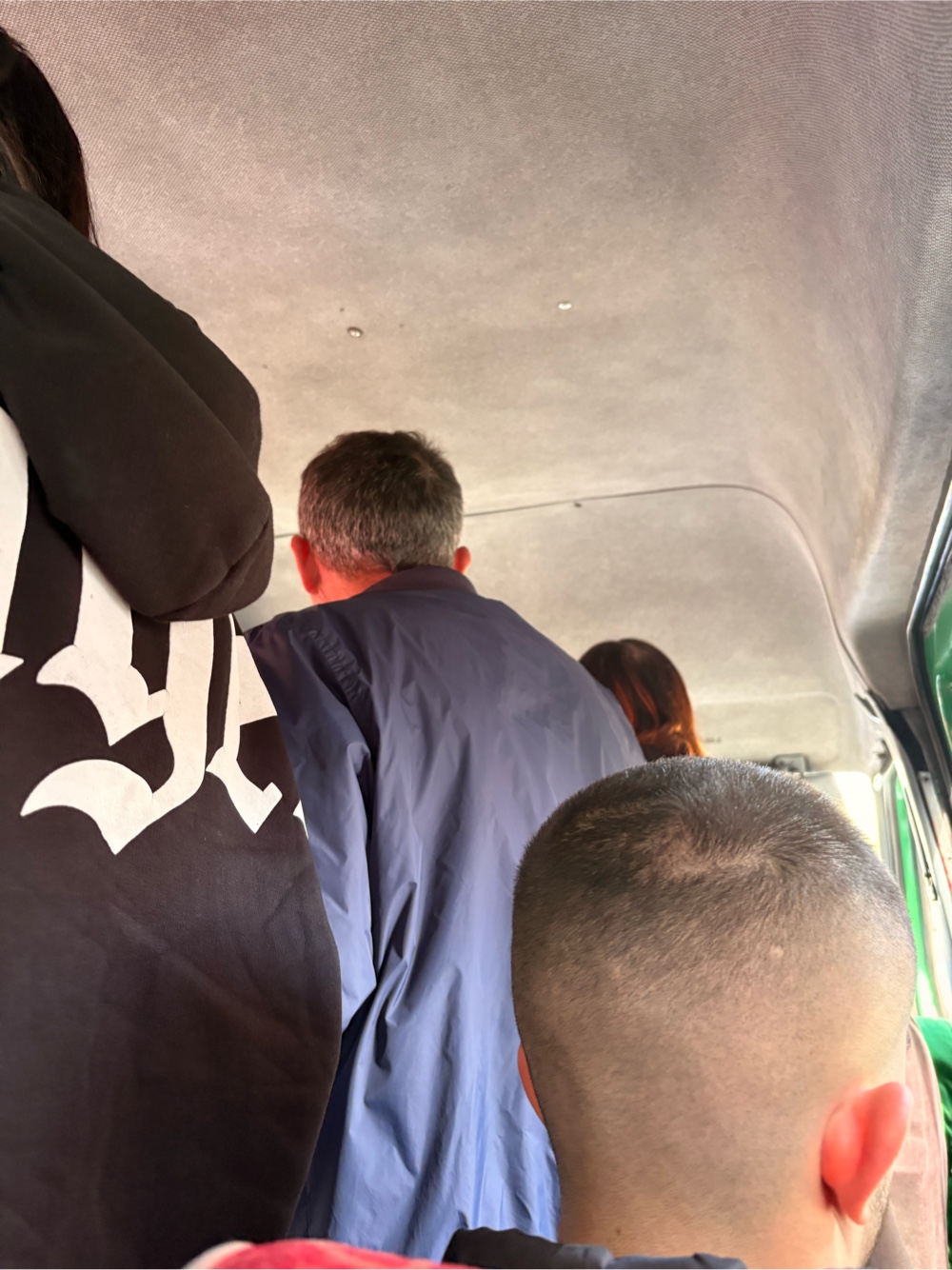 Das ist eigentlich ein ziemlich chaotischer Parkplatz, wo viele Busse stehen. Viele davon haben ein Schild vorne drin wo sie hinfahren so suchte ich eine Weile, bis ich meinen Bus gefunden habe. Es ist ein kleiner 16 Sitzer und es sollten eigentlich nur zehn Sitze sein. Aber mit etwas Mühe passen hier auch 16 Sitzplätze. Plus Gepäck. Mit anderen Worten, es ist schön eng.