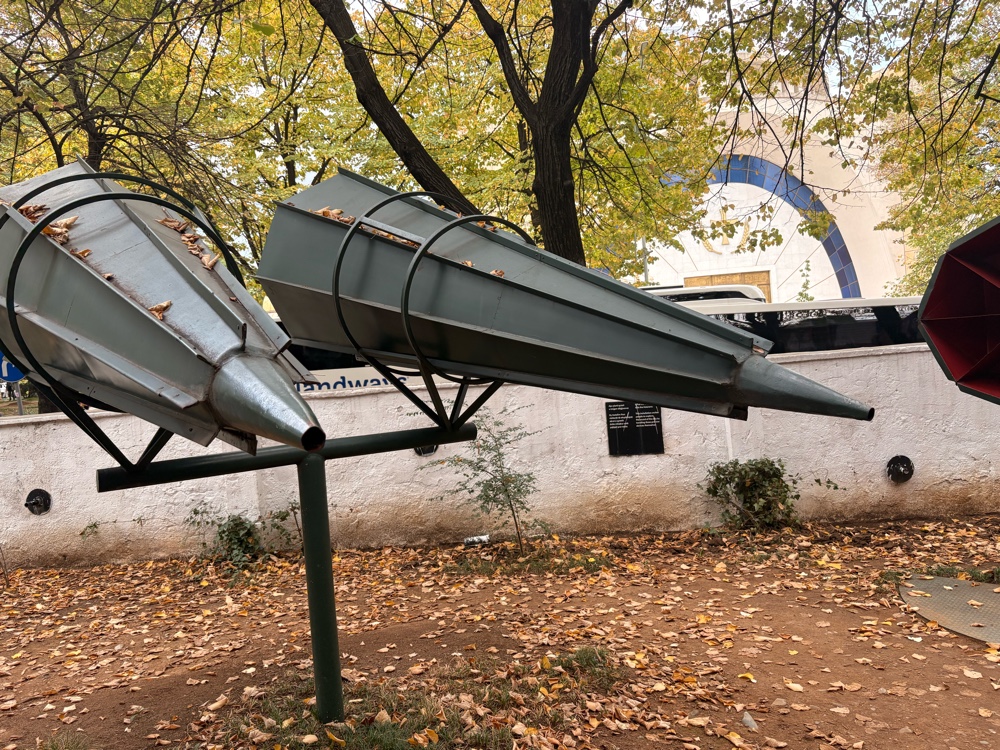 Außerdem gab es noch zwei Gerätschaften, mit denen man ausprobieren konnte, wie einfach man Geräusche verstärken kann. Wenn man da an die Öffnungen sein Ohr hielt, wurden die Geräusche aus der Umwelt deutlich lauter. Jetzt kann man sich vorstellen, was mit den elektronischen Mitteln, die damals gut vorhanden waren, möglich war.