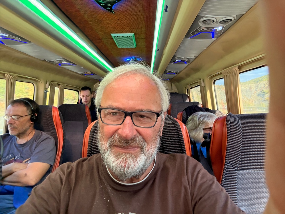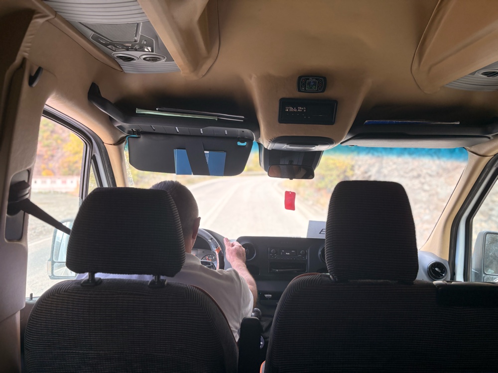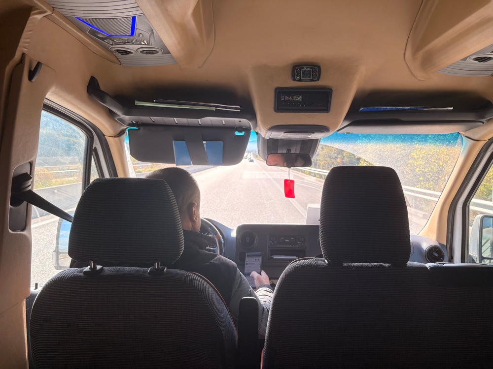 Der Fahrer fährt sehr vorsichtig und langsam, und schnell wird mir auch klar, warum: auf der Strecke habe ich allein zwei Geschwindigkeitskontrollen gesehen, und eventuell hat er sogar noch mehr gesehen. Zwischendurch haben wir einen Fahrerwechsel und ich kann sehen, dass die Fahrer irgendeine ID-Karte in ein Gerät hier im Auto stecken, offensichtlich eindeutig, wer das Auto fährt. Ich schlecht..