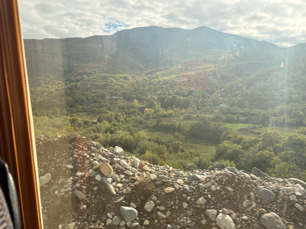 Das Wetter ist schön und mit einem kleinen Minibus fahren wir in Richtung Grenze. Es geht in die Berge, und die Landschaft ist eigentlich ganz schön, leider sind die Fenster sehr schmutzig, dass man keine Fotos machen kann. Es gibt hier auch interessante, sehr lange Straßenbaustellen, für die man eigentlich einen Geländewagen brauchen würde, aber unser tapferer Bus kämpfte sich da durch.
