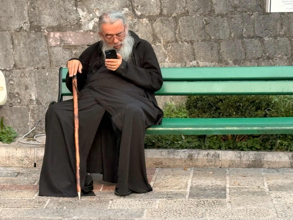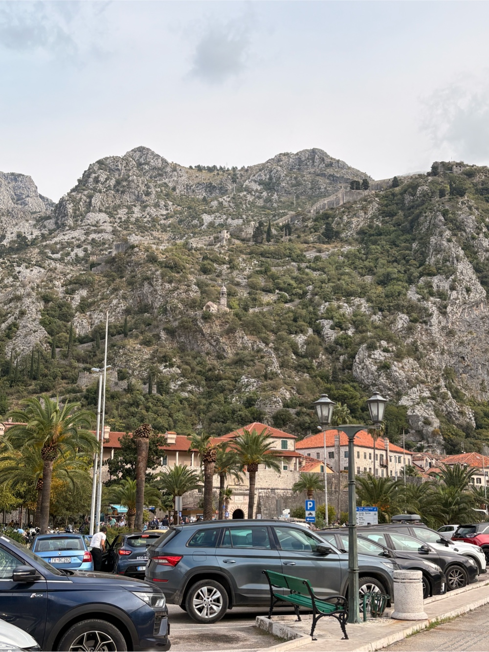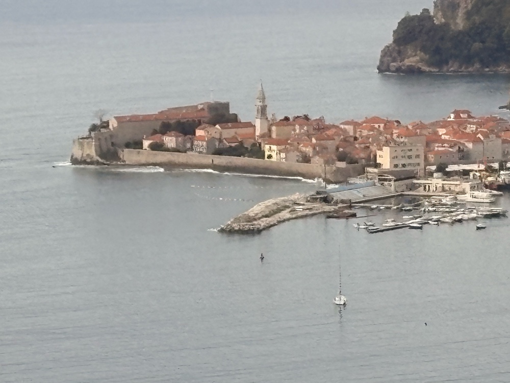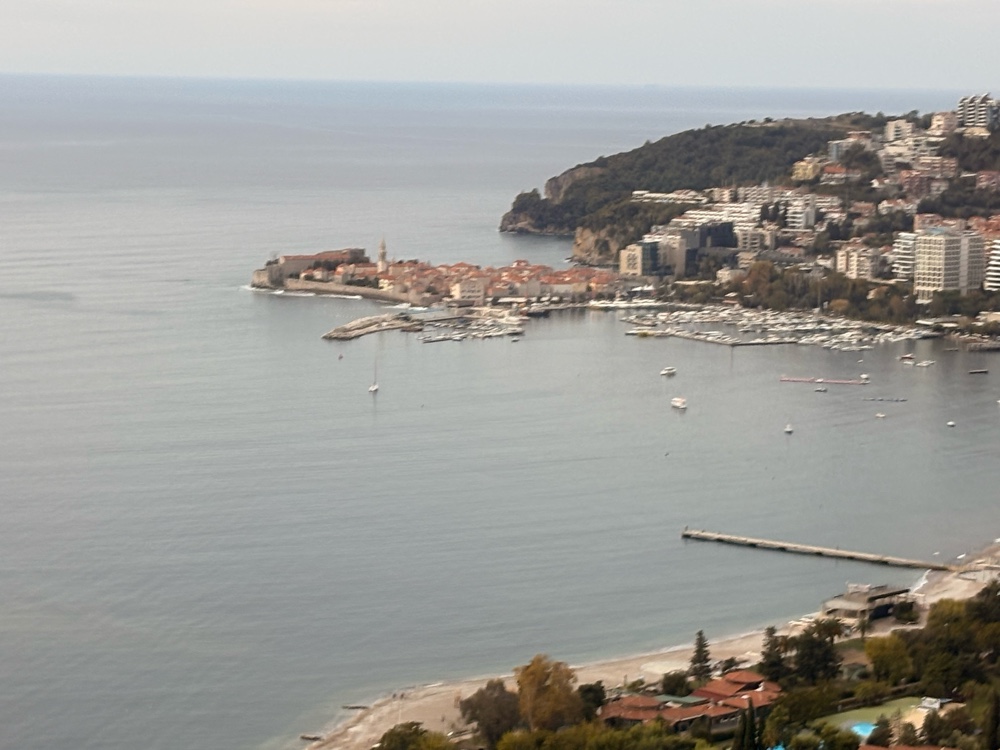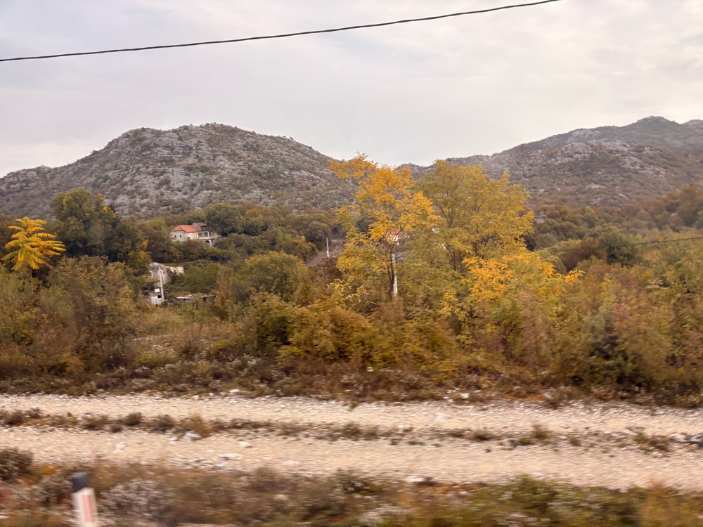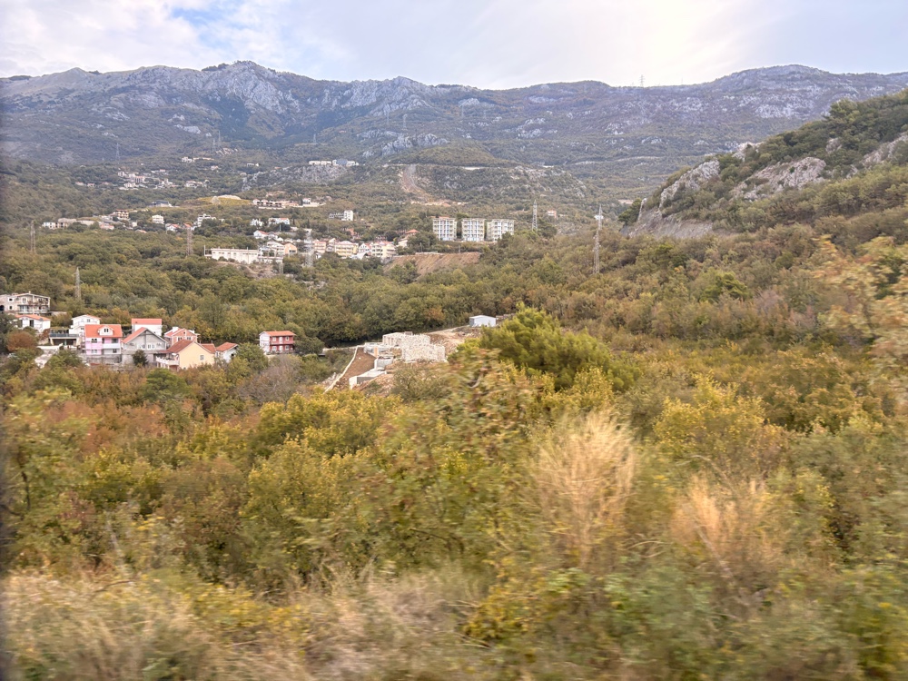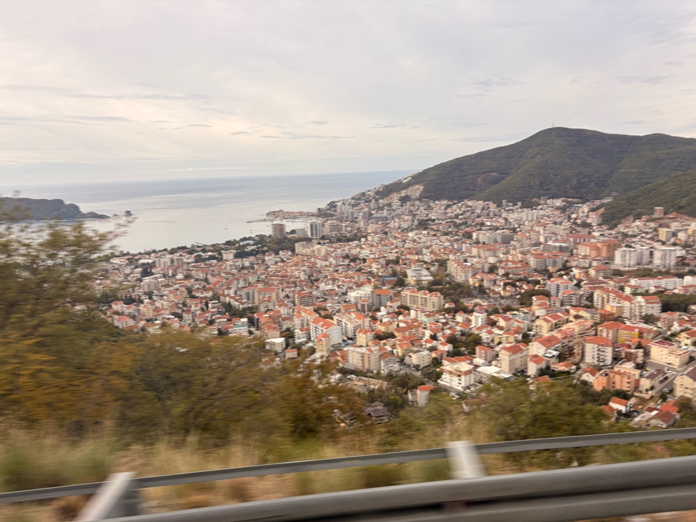 Die Fahrt verlief ruhig. Das Wetter sah, bis auf die grauen Wolken, ganz freundlich aus, aber das wird sich im Laufe des Tages zeigen. Wir fahren durch Berge und dann irgendwann mal geht es ziemlich steil bergab wieder zum Meer runter. Wir kommen durch kleine Städte wie zum Beispiel Budva, wo ich den Eindruck habe, dass viele der Gebäude sehr neu sind. Die ganze Fahrt dauert circa 2 Stunden und das ist für mich eine total komfortabel Art, zu reisen. Nicht zu lange, und der Bus hat auch ein bisschen Platz, so kann man sich gemütlich durch die Gegend schaukeln lassen.