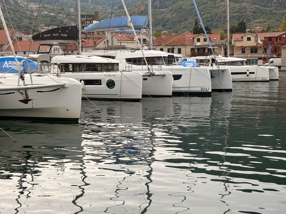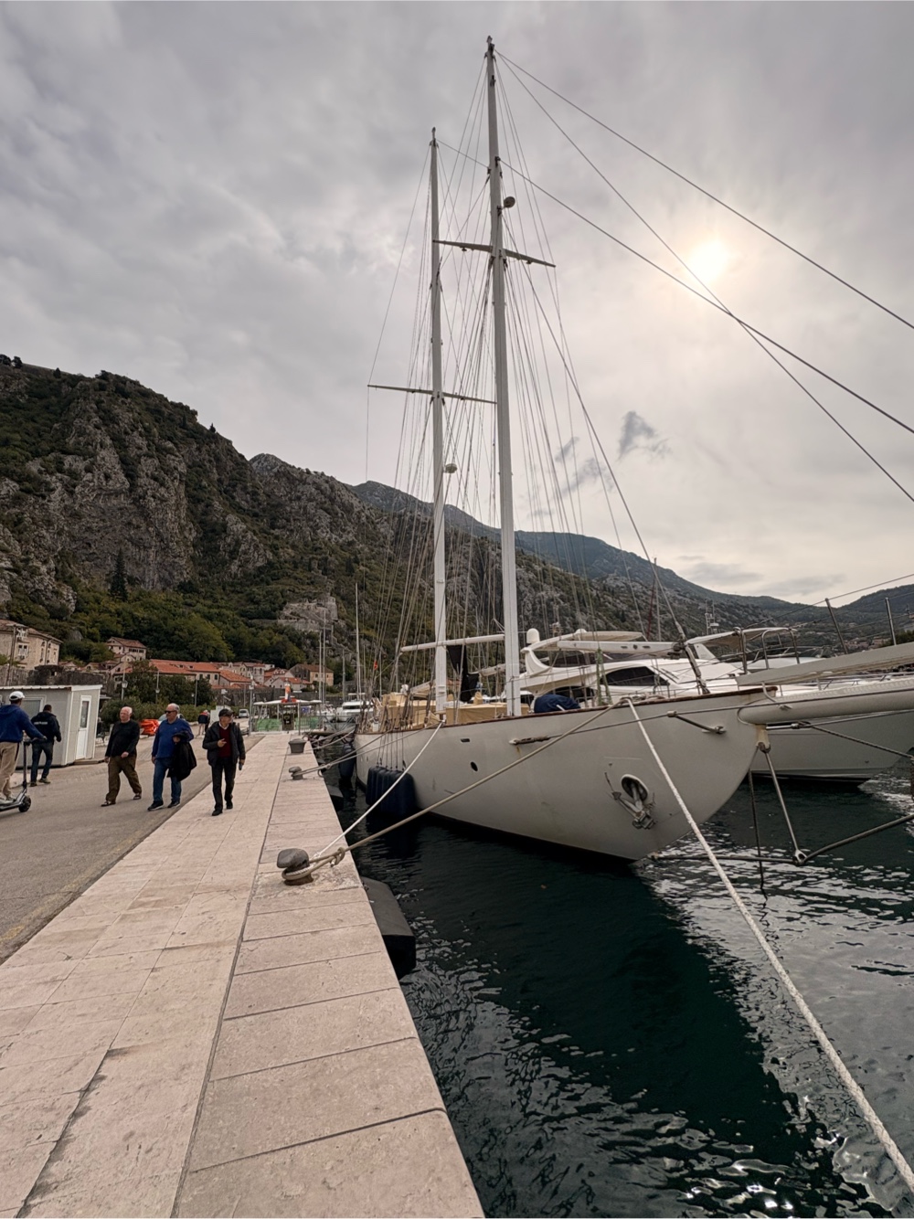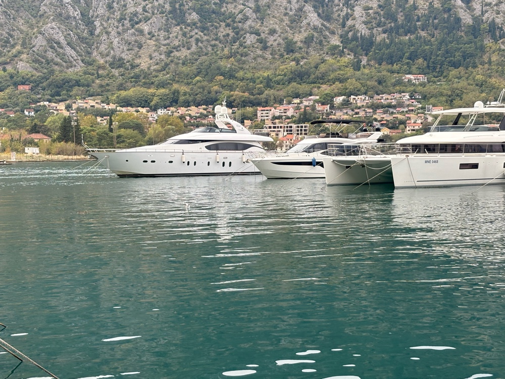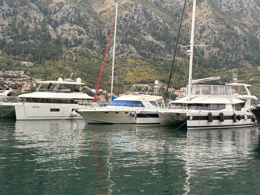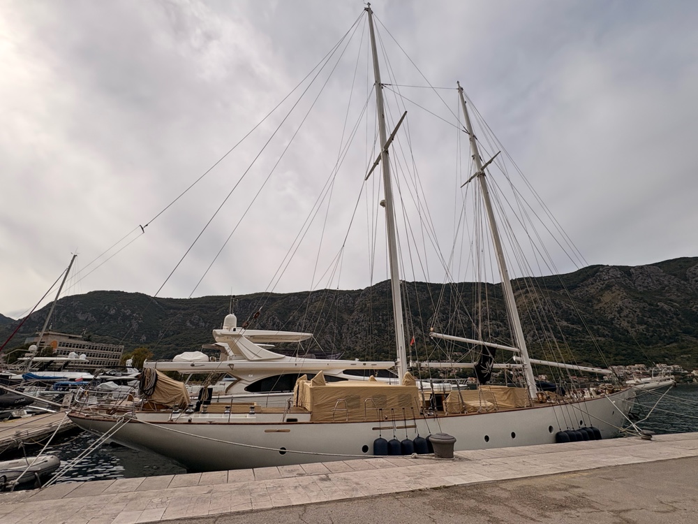 Und dann ist da natürlich auch noch der Hafen. Er ist relativ klein, höchstens 30 oder 40 Yachten liegen hier. Natürlich sind da auch ein paar sehr hübsche Schiffe dabei. Die Bucht von Kotor ist ja relativ groß und man fährt schon eine ganze Weile, bis man im offenen Mittelmeer ist. Aber so ist das ein sehr schöner geschützter Hafen.