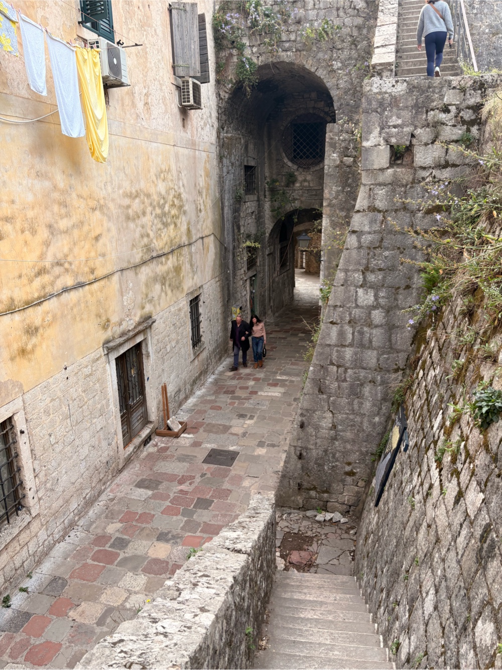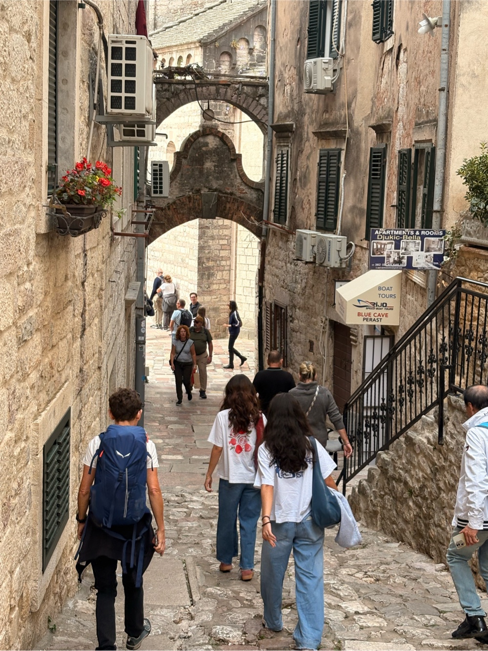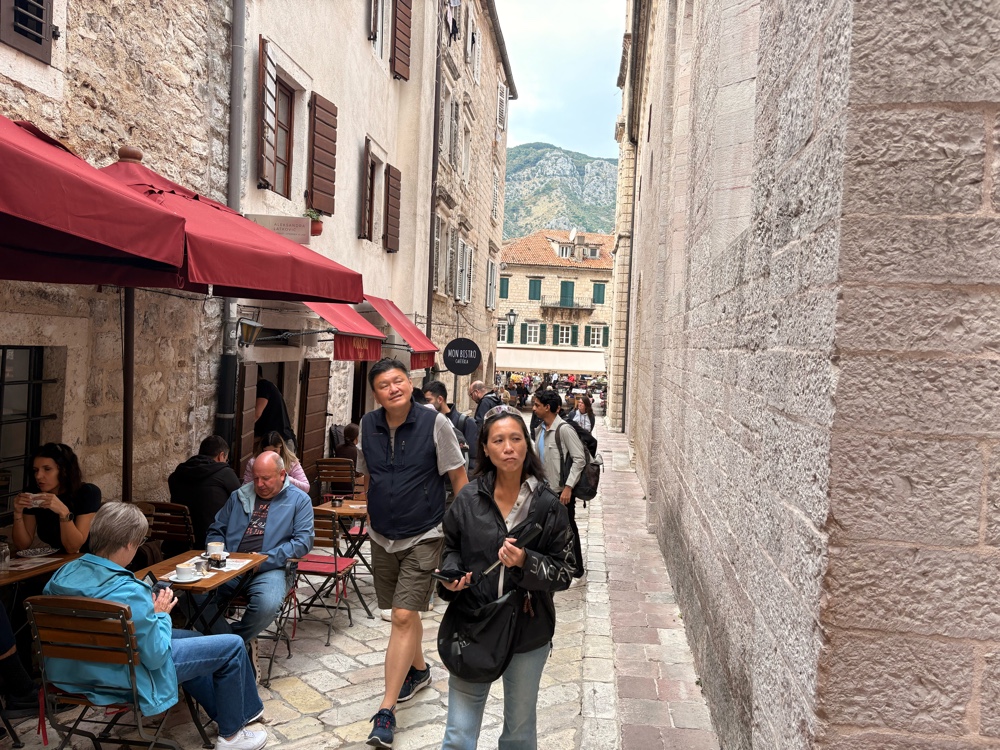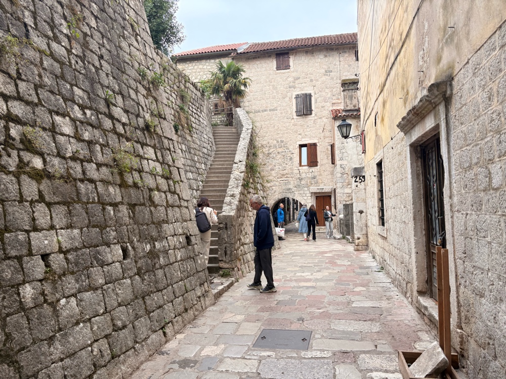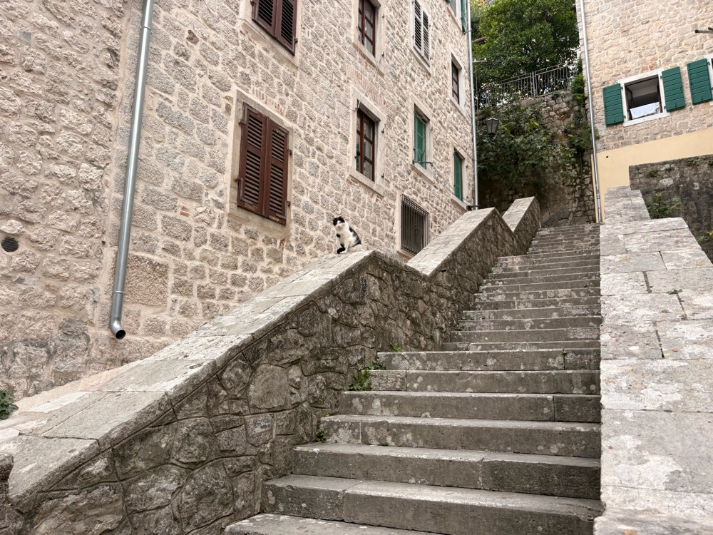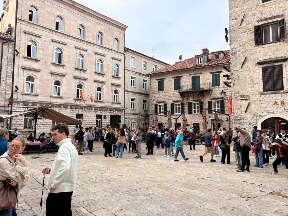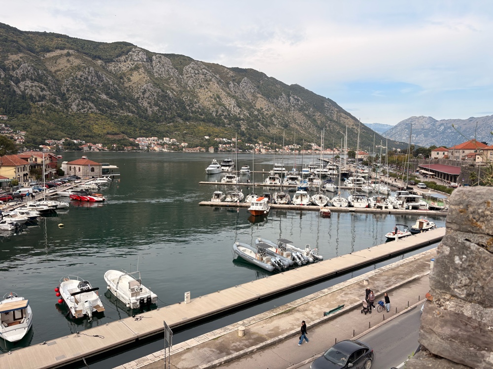 Kotor entstand, weil eine natürliche Bucht einen guten Hafen bildete. Auch in den Kriegen hatte der Hafen strategische Bedeutung. Daneben gibt es in der Stadt viele historische Bauwerke aus der glorreichen Zeit. Ca. 25.000 Menschen wohnen in Kotor, also etwas mehr, als in dem Stadtteil von Düsseldorf, in dem ich wohne. Es gibt hier eine lange Stadtmauer, eine Kathedrale und mehrere alte Kirchen