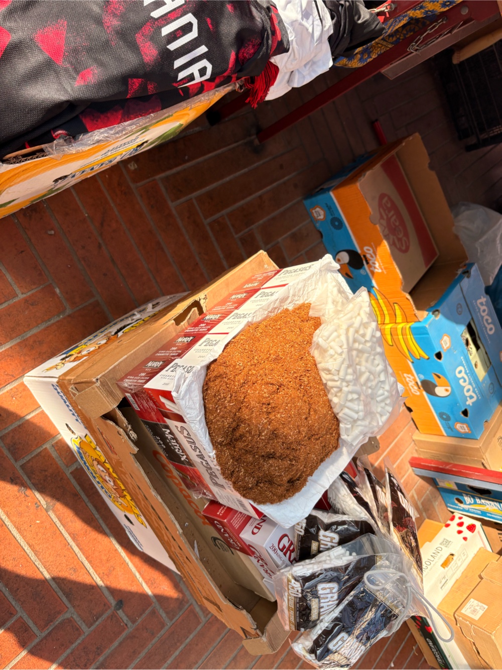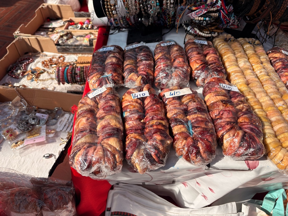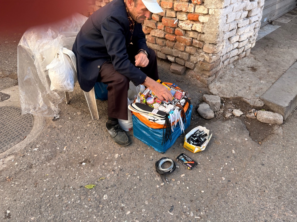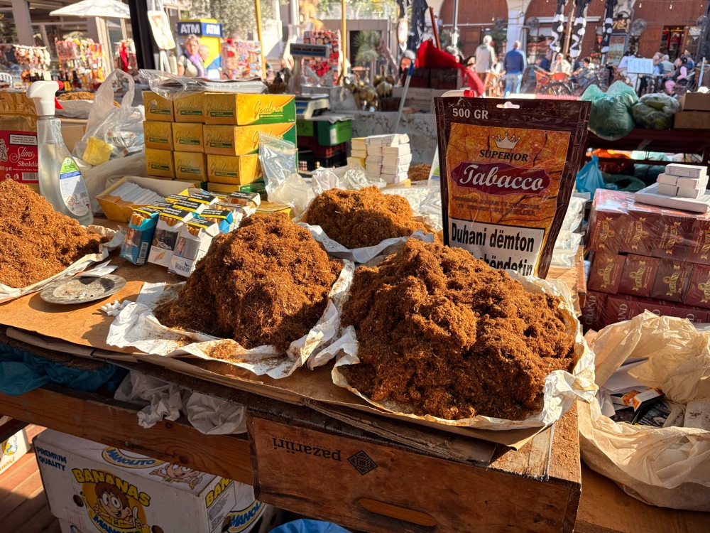 An mehreren Ständen wird Tabak verkauft. Da liegen offen große Mengen Tabak rum, die kleine Berge und daneben große Tüten mit Filtern. Ein Händler spricht mich an und fragt mich, woher ich komme. Wahrscheinlich, um den Preis festzulegen. Ob hier wirklich alle Steuern abgeführt werden? Oder ist das eine dumme Frage?