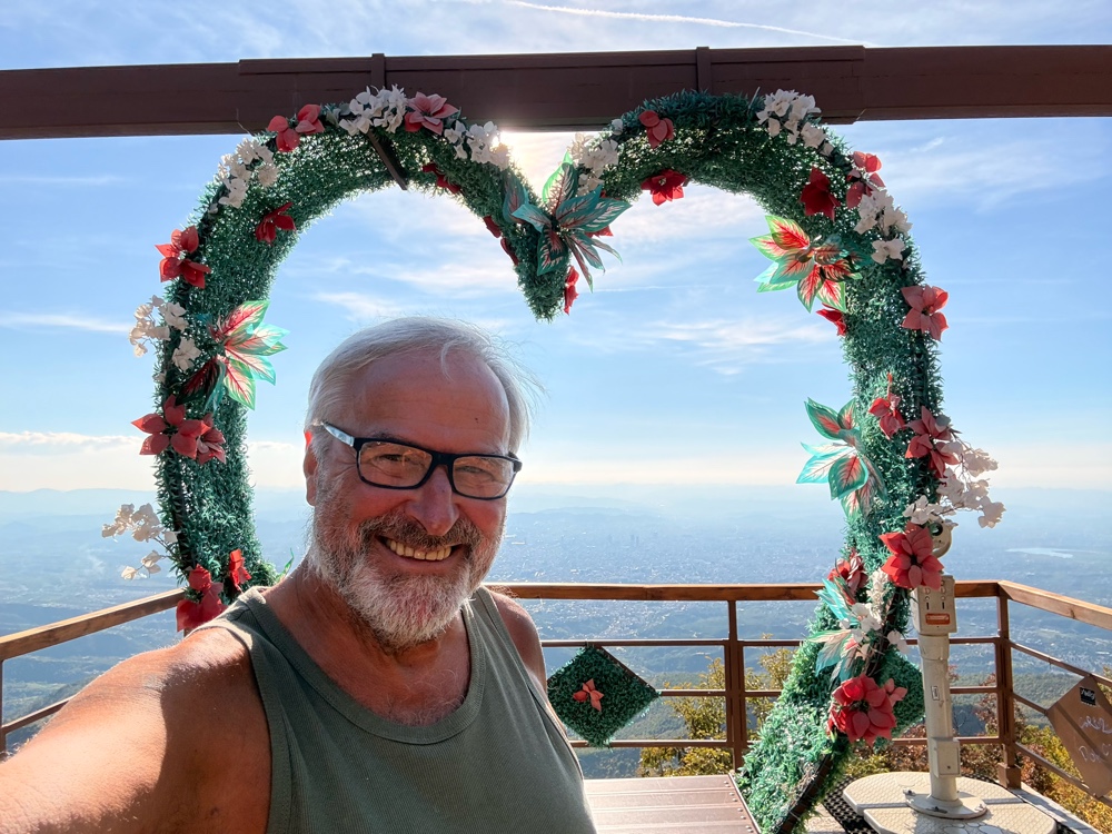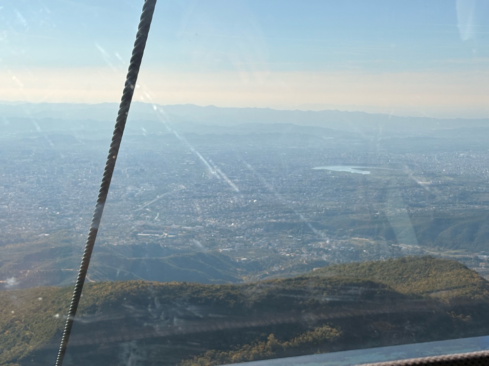 Insgesamt ist der Blick atemberaubend. Man sieht um sich herum überall die Berge und weit unter sich sieht man die Stadt mit einem bunten Gemisch aus kleinen Häusern, Häuser mit zehn Stockwerken oder mit richtigen Hochhäusern. Es sind mehrere Seen im Blickfeld und viel Grün. Der Himmel ist fast wolkenlos. Es ist nur ein wenig dunstig. Es sieht wie ein freundliches Land aus!