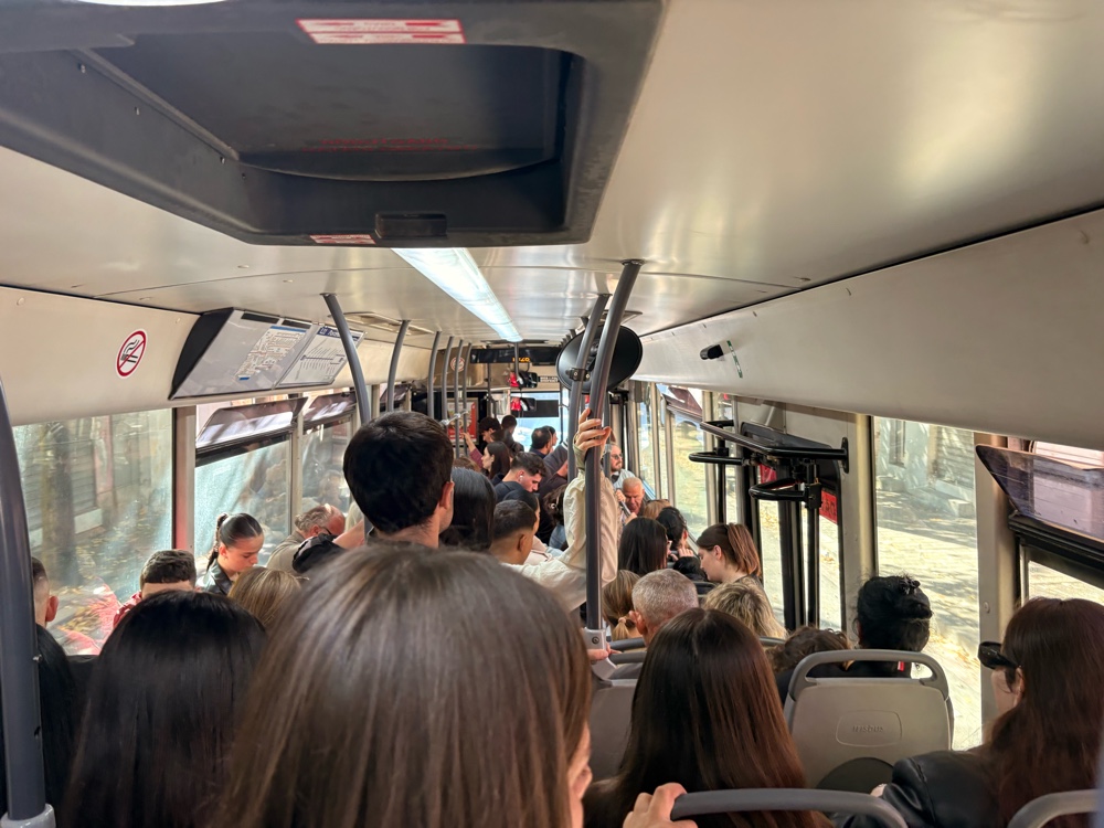 Die erste Fahrt geht über fünf Stationen, dann muss ich umsteigen. Hochintelligent wie ich bin, nehme ich dann erst mal den Bus in die falsche Richtung. Auch der ist sehr überfüllt. Ich steige aus, aber zum Glück kommt auch direkt der Bus in die andere Richtung aber auch der ist komplett voll. Man kann definitiv nicht hinfallen! Circa zehn Stationen fahr ich hier mehr oder weniger im Stehen, dann kann ich einen Sitzplatz ergattern. An jeder Station warten immer viele Leute, von denen immer nur ein Bruchteil in den Bus hineinkommt. Erst fünf Stationen vor der Endhaltestelle, wo auch ich hin will, lichte sich es etwas und die Leute, die an der Haltestelle warten, können nun alle alle einsteigen.