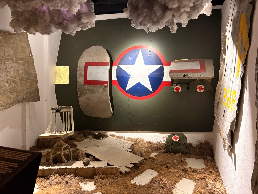 In einem Raum werden die Überreste eines amerikanischen Flugzeuges gezeigt. Das Flugzeug musste notlanden wegen schlechten Wetters, wobei alle Insassen überlebten. Die Einheimischen hier versteckten die Amerikaner und bauten das Flugzeug Stück für Stück auseinander, um es vor dem Blicken der Truppen zu verstecken. Die hier gezeigten Teile sind Original haben viele Jahre in irgendwelchen Scheunen überlebt.