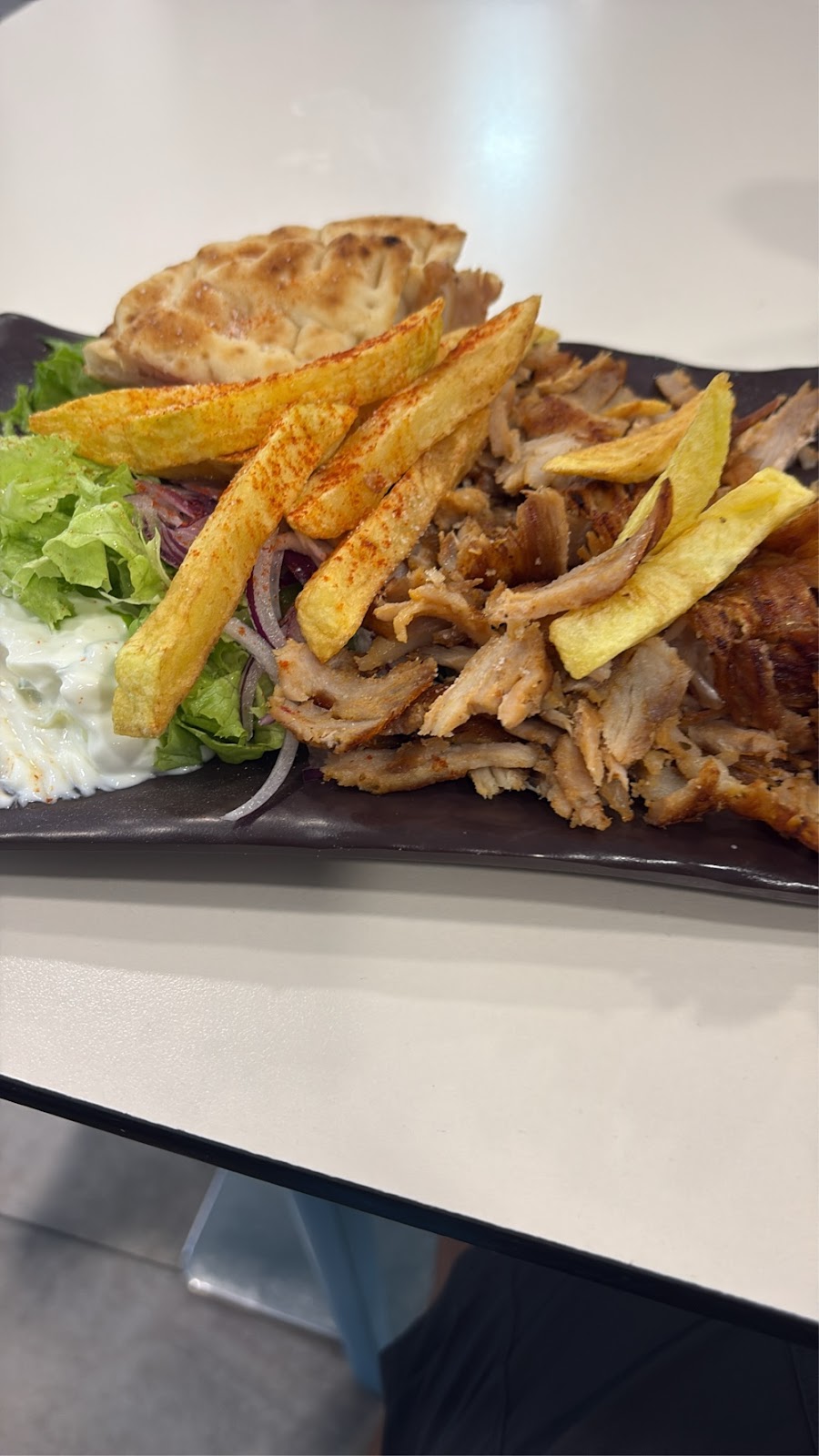Eigentlich eine Pommesbude, aber der Geruch kam eindeutig daher. Auch die Sicherheitsfrage (kann ich mit Karte bezahlen) wurde positiv beantwortet und so habe ich hier ein sehr, sehr leckeres Gyros mit einem leckeren Salat bekommen und einem kleinen Bier. Für kleine Kohle aber sehr sehr lecker und völlig ausreichend. Ich hatte den ganzen Tag außer des Frühstücks nichts gegessen. Von daher passte das jetzt sehr gut. Perfekter Tag!