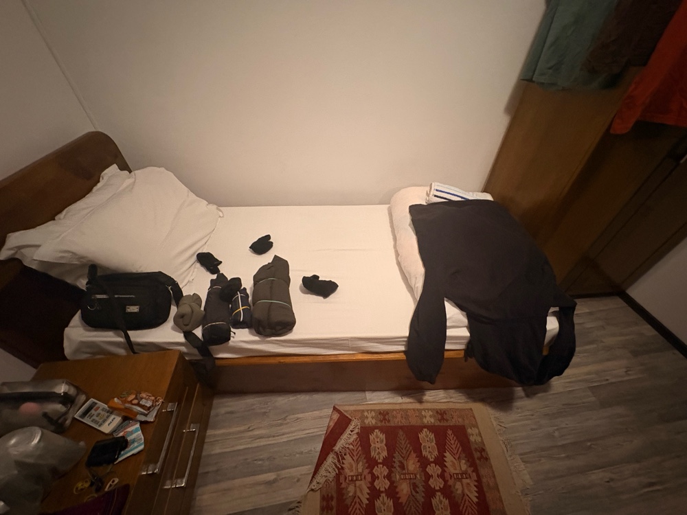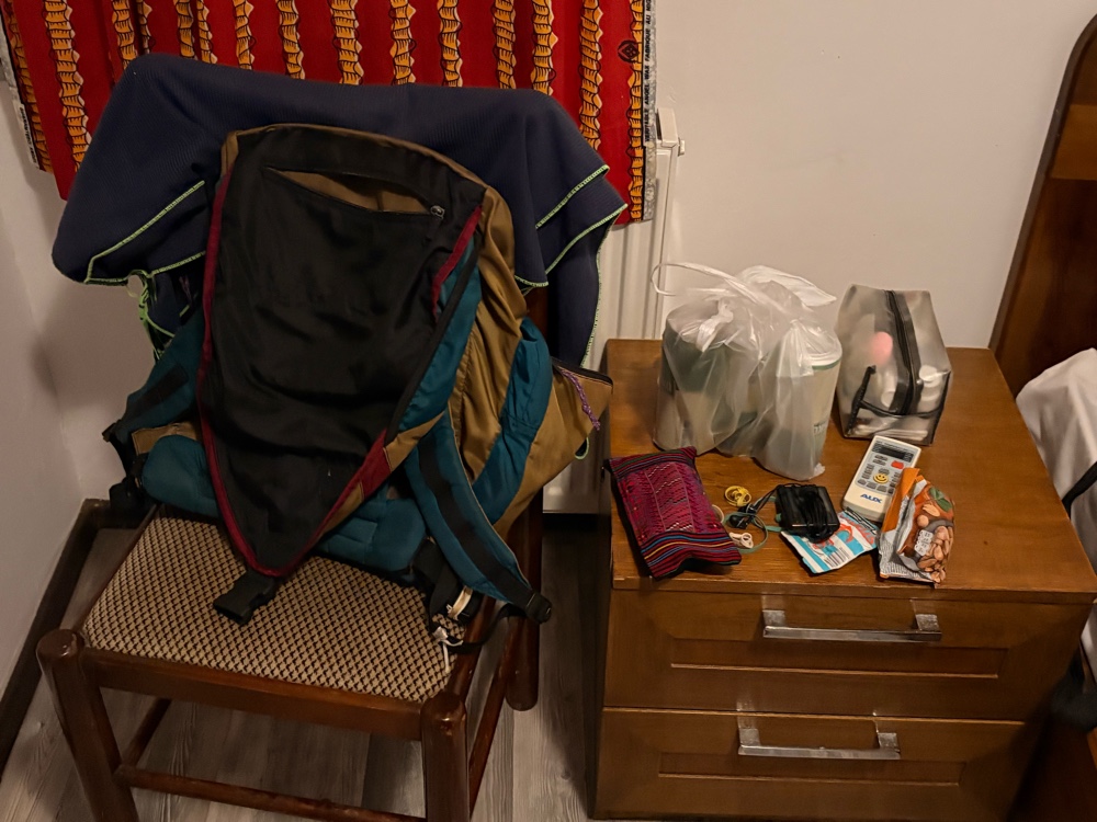Und so kam es auch, ein sehr freundlicher Taxifahrer brachte mich zu meiner Unterkunft, die klein, aber trocken ist. Dort habe ich dann meine ganzen Klamotten über das Zimmer verteilt, damit sie trocknen können.