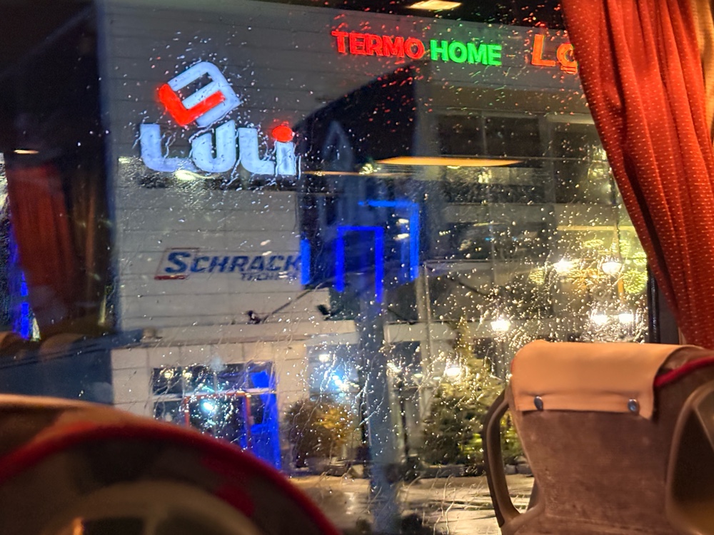 Wenn wir durch kosovarische Städte kommen, habe ich den Eindruck, dass die Leute hier auf riesige sehr sehr bunte Leuchtreklamen stehen. Wenn sie aber eher das Kapital in die Reparatur der Durchgangsstraße gesteckt hätten, würden wir hier höhere Geschwindigkeiten (wegen der monströsen Schlaglöcher) möglich sein. Wir halten immer wieder an und der Fahrer läßt ein Rad nach dem anderen langsam durch das Schlagloch rollen. Es zieht sich!